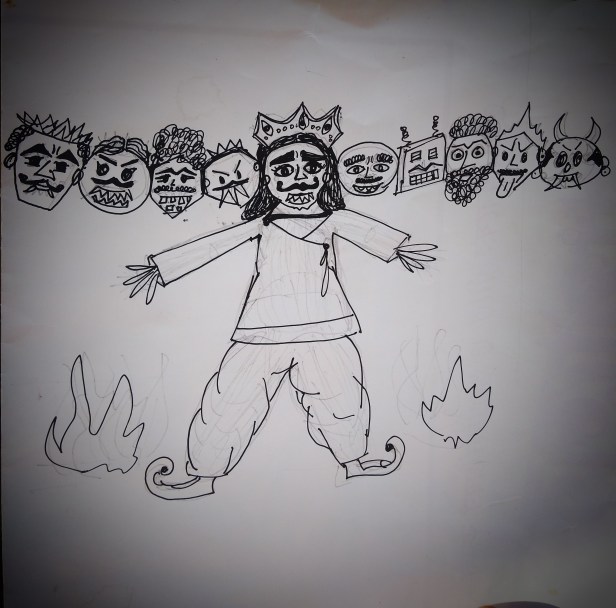 The show started on time. Chotu was dressed as Ram and was standing in his allotted position. A rocket bomb was placed in a tilted bottle and it aimed directly at Raavan’s belly. He was supposed to light it. People started shouting “Jai Sri Ram!” upon seeing Chotu. A medley of the chanting and Raavan’s roaring laugh could be heard from the loudspeakers. Someone helped Chotu to light the rocket bomb. At this point an unexpected thing happened. The rocket whooshed towards Raavan’s belly, made a little sound and vanished. Another rocket was fired from Chotu’s hand but it also went poof! The chanting now reduced to murmurs. There was restlessness in the crowd and a lot of panic in our Raavan Dahan committee. The roaring laugh of Raavan continued as the peon was instructed to stop it only when the effigy burns. It seemed as if Raavan was mocking at everybody. Finally our committee boys got impatient. Each one of them took a fire torch, and ran towards Raavan as if they are going to fight a battle with him. They directly incinerated the effigy from its feet. Immediately it burst into flames. It was quickly followed by the deafening sound of bursting crackers. The temperament of the crowd changed. People resumed their chants. Some covered their ears and others jumped with excitement. It seemed, in today’s world, one Ram alone cannot destroy the evil. It needs the combined effort of so many people.